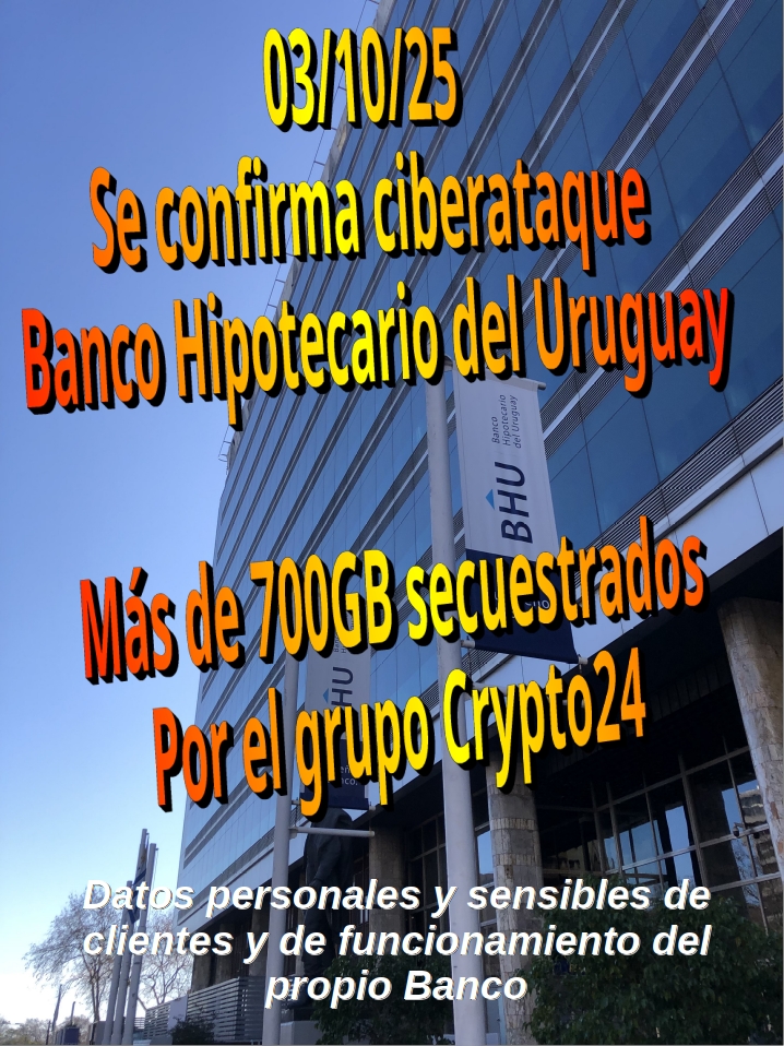 En el día de hoy, 3/10/2025, el grupo Crypto24 acaba de hacer pública en la Dark Web la autoría del ataque de ransomware al BHU. Esto ha sido confirmado por varias empresas de seguridad internacionales y distintos medios de noticias. Desde el día de ayer los servicios del Banco estaban fuera de línea tanto en …